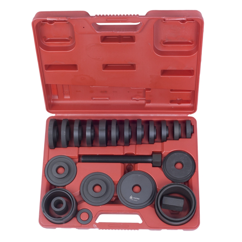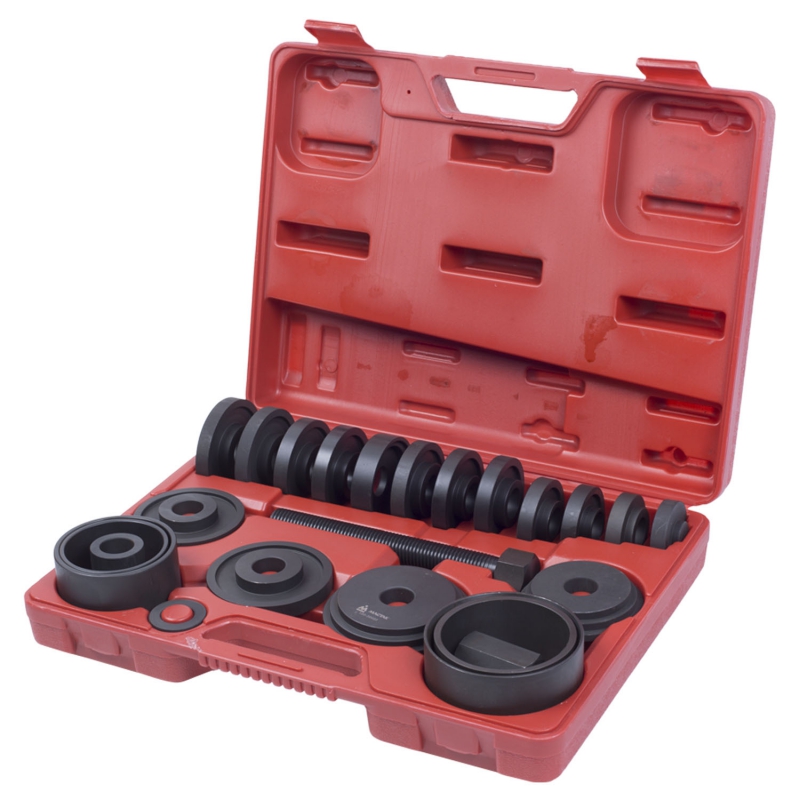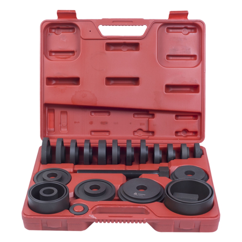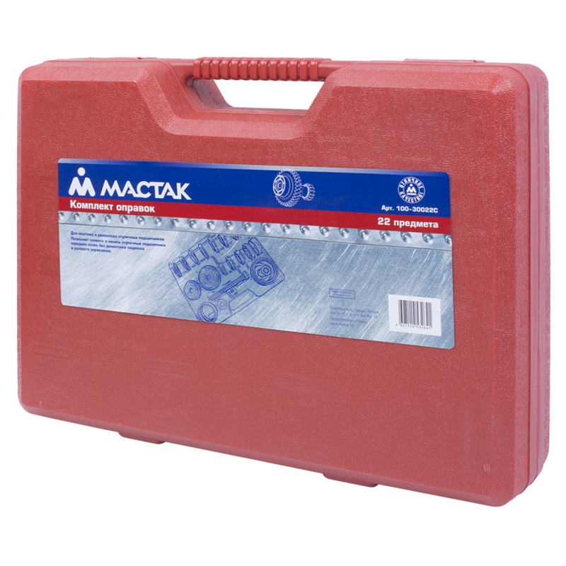 Комплект оправок, представляемый производителем автоинструментов МАСТАК поможет мастеру в замене и установке подшипников. Набор включает в себя 22 предмета - гайку, шайбу, оправки различных размеров и силовой болт, упакованные в легкий, но прочный и удобный для хранения кейс из пластика с ручкой. Кованая инструментальная сталь, использованная для изготовления аксессуаров, не позволит им деформироваться во время службы.
