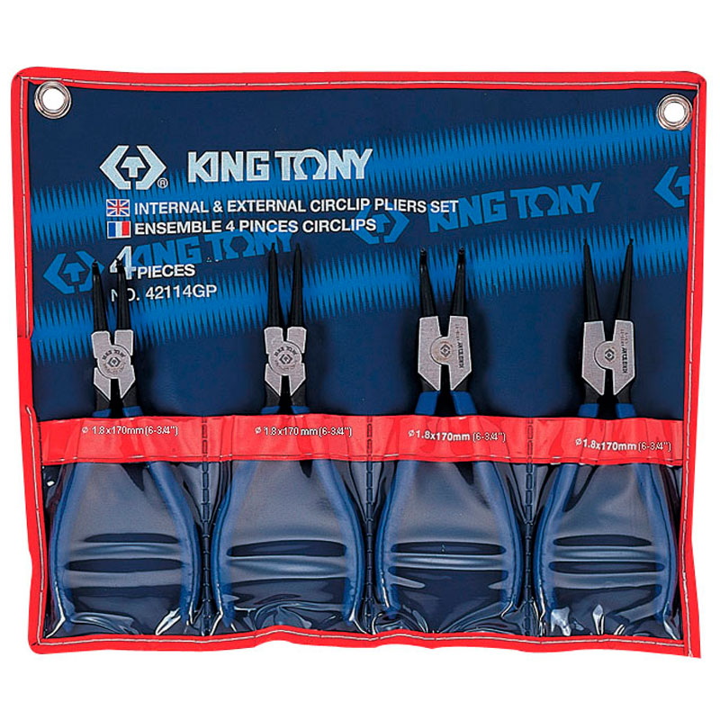 Набор известного бренда King Tony состоит из четырех съемников, используемых для демонтажа стопорных колец. Широко применяется в автомастерских и на станциях техобслуживания. Рабочая часть инструментов была подвержена обработке высокими температурами для устойчивости к сколам и износу. Рукоятки имеют эргономичную форму. Пластиковый чехол с кармашками для удобного хранения.