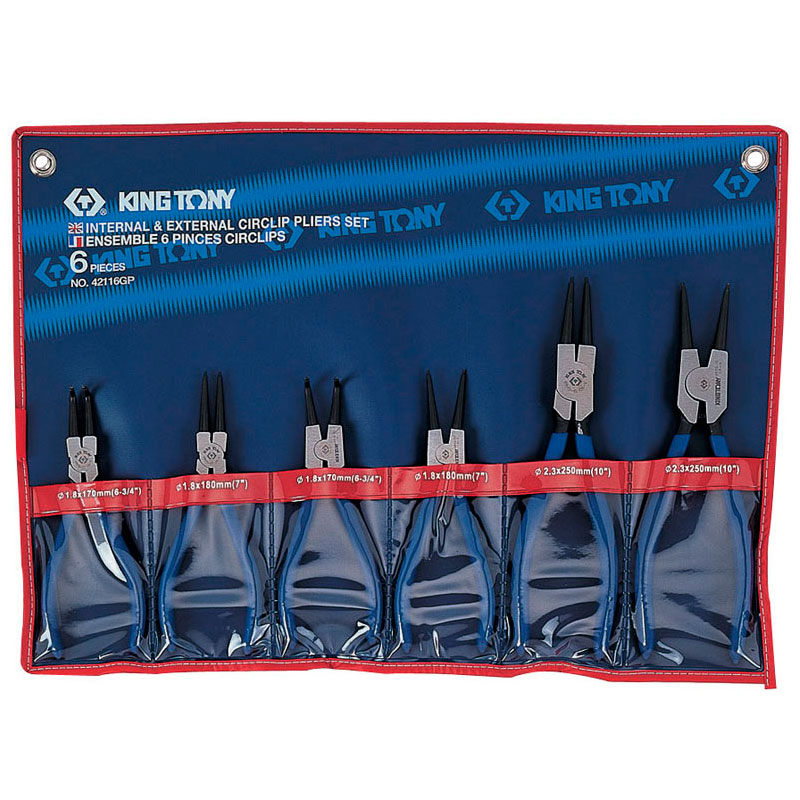 Набор известного производителя King Tony включает в себя шесть съемников для демонтажа стопорных колец. Не заменим на станциях техобслуживания и в автомастерских. Изделия прошли термическую обработку, обеспечивающую высокую износостойкость и устойчивость к механическим повреждениям. Чехол с кармашками способствует удобному хранению инструментов.