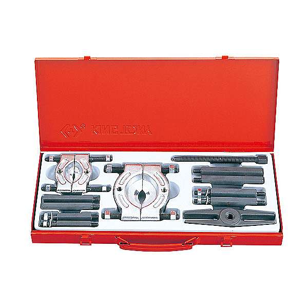 Комплект съемника подшипников сегментного типа из 12 комплектующих. Используется для разборки втулок, шестеренок, муфт, установленных с плотной посадкой. В состав входят: 2 вида съемников различного размера, удлиняющие штанги, поперечная балка и центральный резьбовой болт. Применяется в ремонтных и производственных мастерских.