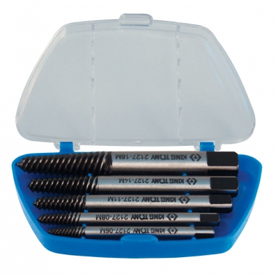Набор экстракторов King Tony включает в себя 5 предметов конической формы размером от 4 до 19 мм, которые используются в качестве оснастки воротка или другого инструмента для вращения, например, метчикодержателя. С помощью данных инструментов можно быстро и аккуратно удалить остаток обломавшейся шпильки, винта, самореза или болта без повреждения основной конструкции. Комплект наиболее востребован при проведении столярных и слесарных работ.