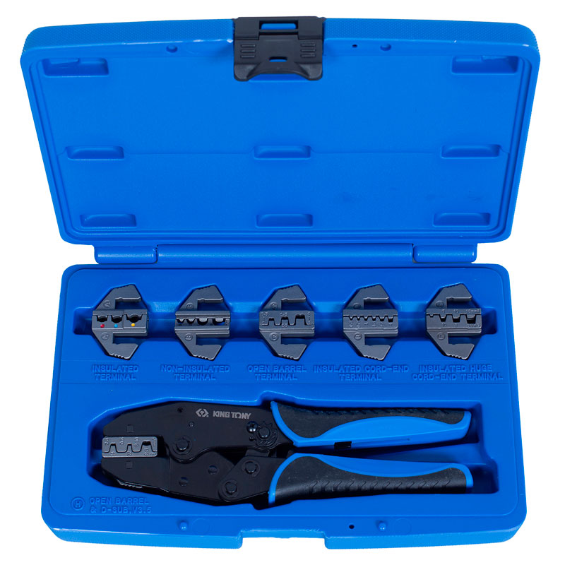 Кримпер торговой марки King Tony используется в автосервисах и мастерских для обжима различных по конфигурации клемм. Трещоточный механизм способствует комфорту в работе. Эргономичные рукоятки выполнены из двухкомпонентного материала, не подверженного воздействию агрессивных веществ. В комплект также входят шесть губок разного назначения. Пластиковый кейс обеспечивает удобство при транспортировке и хранении набора.