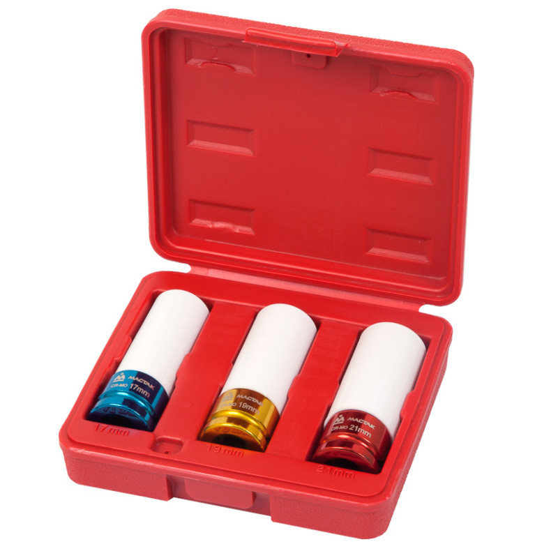 Функциональный комплект от производителя МАСТАК найдет свое применение как в крупном сервисе, так и в арсенале частного автослесаря. В набор включены 3 ударные торцевые головки глубокие размером 17, 19 и 21 мм. Посадочный квадрат 1/2 позволяем присоединить аксессуары к гайковерту. Хром-молибденовый сплав устойчив к силовым нагрузкам, покрытие из пластика обеспечит дополнительную защиту.