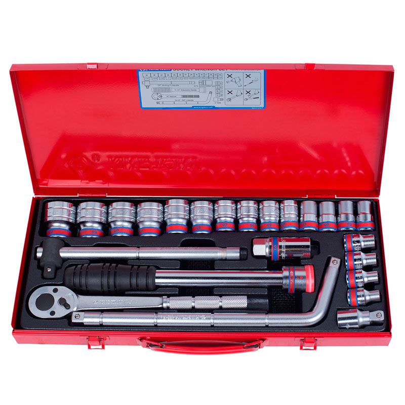 Набор торговой марки King Tony включает в себя стандартные торцевые головки, удлинитель, рычаг-трубу, трещотку с флажковым переключателем, скользящий и шарнирный воротки, свечную головку и металлический кейс для удобного хранения инструмента. Изделия изготовлены из высококачественной легированной стали с хромированным покрытием, предотвращающим появление коррозии.